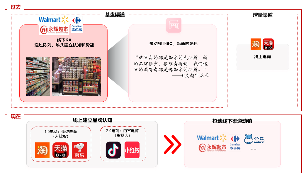 對于(yu)食飲齊(qi)業而言,線(xiàn)上線(xiàn)下渠道缺一(yi)不可(kě)。當前(qian)國(guo)內(nei)的(de)渠道模式(shi)正在(zai)更叠,由原來的(de)“KA建(jian)品(pin)帶流通(tong),線(xiàn)上淘係(xi)成(cheng)增量”變成(cheng)“抖書建(jian)品(pin)提心智,線(xiàn)下渠道擴銷量”,渠道的(de)變化也(ye)孕育了(le)一(yi)批(pi)線(xiàn)下渠道基礎弱、但線(xiàn)上運營(ying)靈(ling)活的(de)“抖品(pin)牌”,在(zai)線(xiàn)上建(jian)心智方(fang)面遠(yuǎn)超那些起于(yu)傳(chuan)統線(xiàn)下渠道的(de)齊(qi)業。